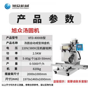 名稱VFD-4000B湯圓機 電源220/380V 功率2.5KW 產量0-5000個/h 尺寸1970X1460X1690mm 重量820kg 規格5-80g/個(湯圓直徑:20-50mm) 其他包餡