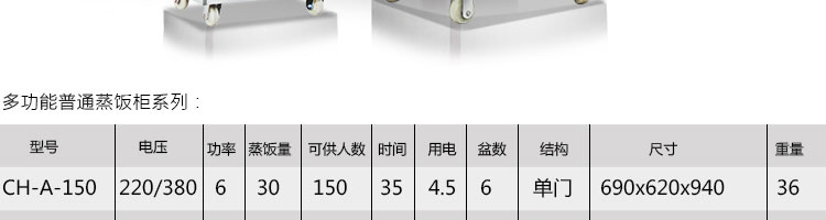 CH-A多功能普通蒸飯柜,適用于大米、面制品、肉類、海鮮類等。深受賓館、飯店、工廠、機關食堂、部隊、大專院校等單位的歡迎。
